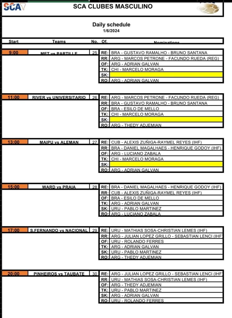 Referee designations for the last day of the SCA Men’s Club Handball SCA in Taubaté, Brazil.