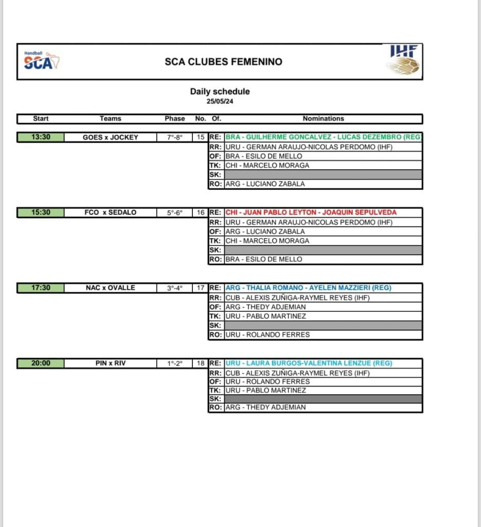Designaciones de árbitros para la última jornada del Campeonato de Handball SCA de Clubes.