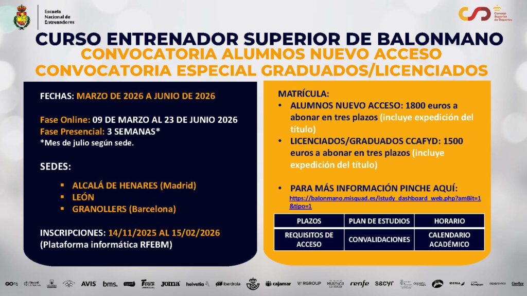 A Escola Nacional de Treinadores, da Real Federação Espanhola de Handebol, anunciou oficialmente a convocação para o Curso Avançado de Treinadores.